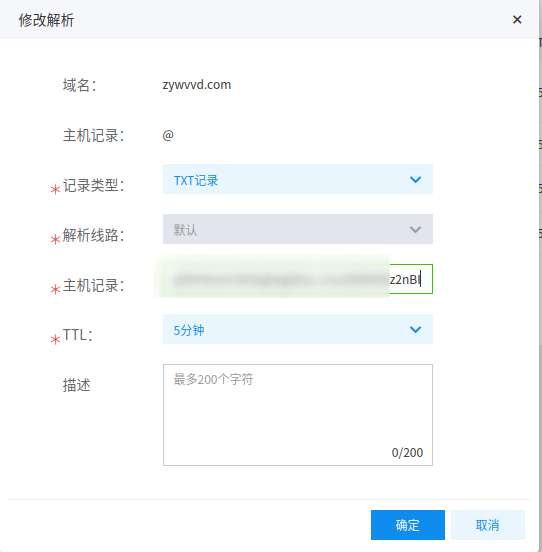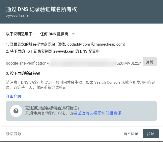 为防止恶意使用该功能,需要验证网域所有权,默认方式通过DNS验证,我们就用这种方法: