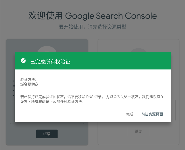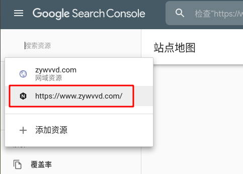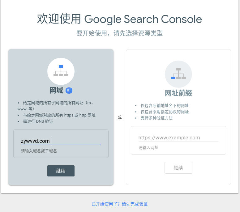 进入Google Search Console,用谷歌账号登录,此时需要选择添加搜索的网址类型,我们申请的域名一般都是域级别的,比如我的 zywvvd.com ,可以建立不同前缀的二级域名,因此我们选择网域: