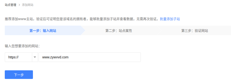 补充个人信息后,来到第一步输入网站,建议为www前缀: