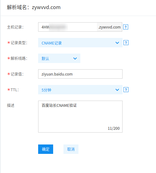 第二步根据个人情况填写信息,每个月只能改一次,确定就好; 第三步选择我们已经熟悉的CNAME验证,根据给定的前缀建立解析,类型CNAME,值填 ziyuan.baidu.com