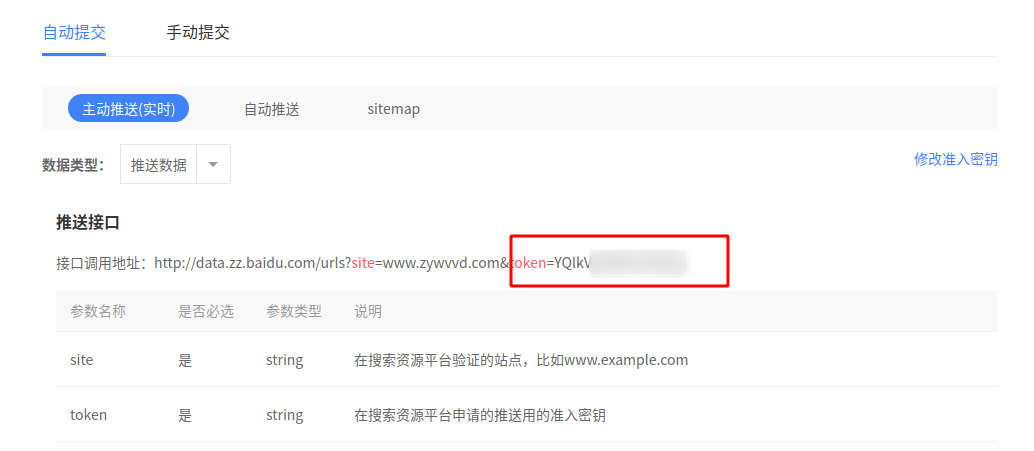 其中的 token 可以在【链接提交】-【自动提交】-【主动推送】下面看到,接口调用地址最后面 token=xxxxx 即为你的 token
