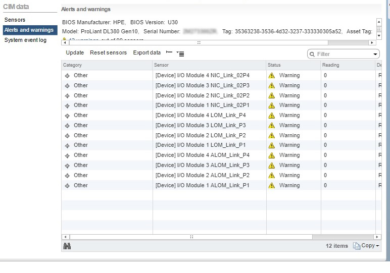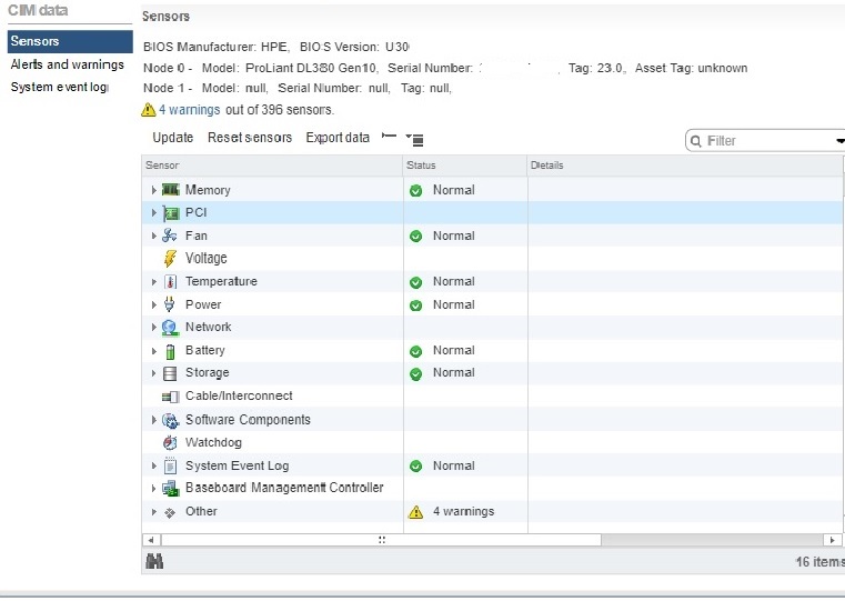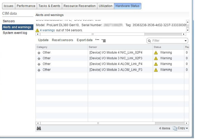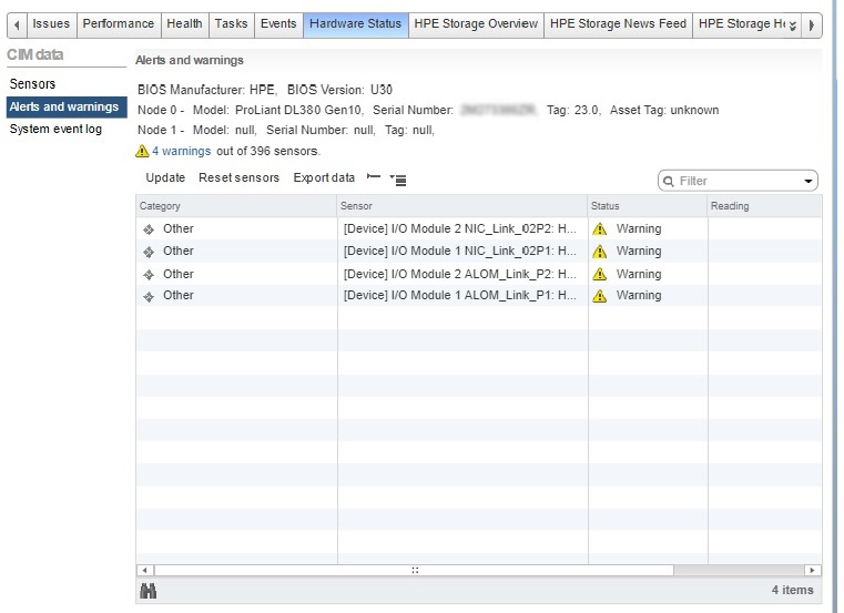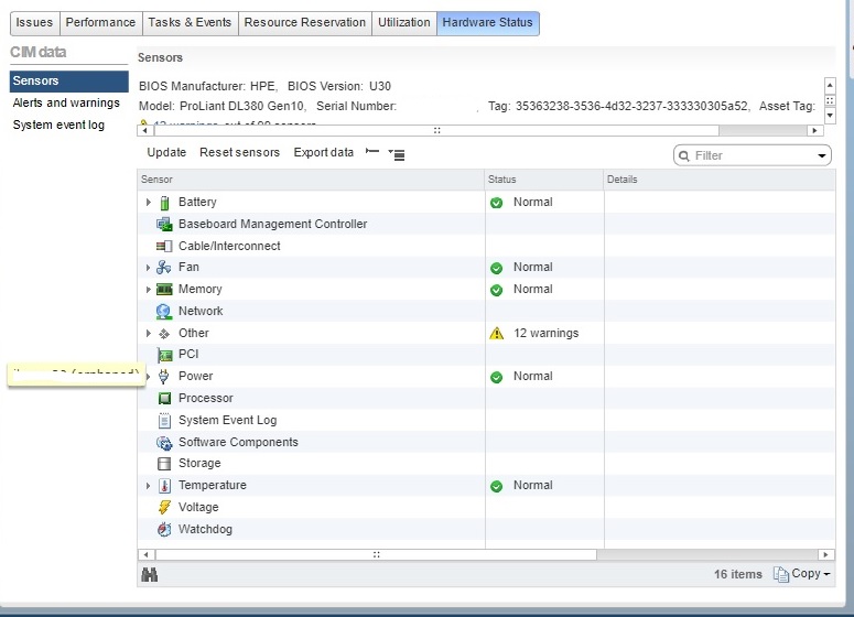 On any HPE ProLiant Gen10 server running VMware VMware ESXi 6.0,VMware ESXi 6.5 or VMware ESXi 6.7 with HPE Integrated Lights-Out 5 (iLO 5) firmware version 1.30, warnings on some of the sensors viewed in the hardware status tab in the vSphere Web Client will be displayed.