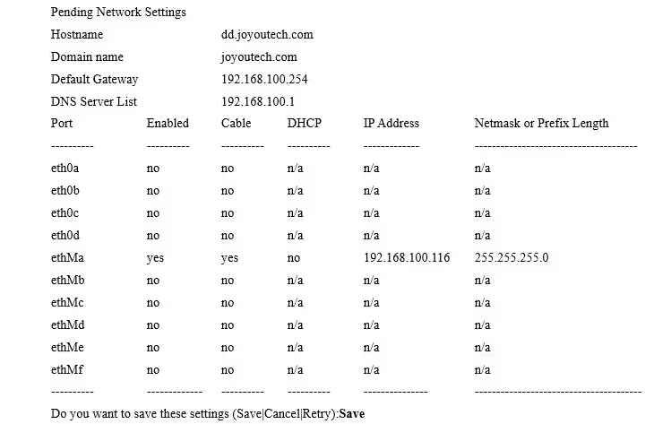 6.显示网络设置摘要,输入Save接受设置