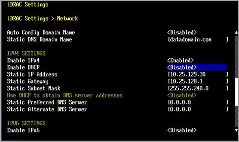 使用KVM连接VGA接口,开机按F2进入BIOS,在iDRAC Settings>Network>IPv4 Settings页面下配置IP地址、子网掩码、默认网关
