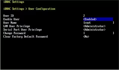 在iDRAC Settings>User Configuration页面,启动root用户,并修改root密码,默认密码为SN。