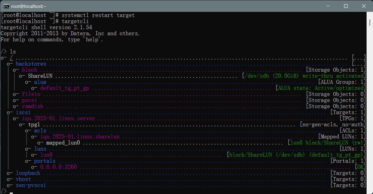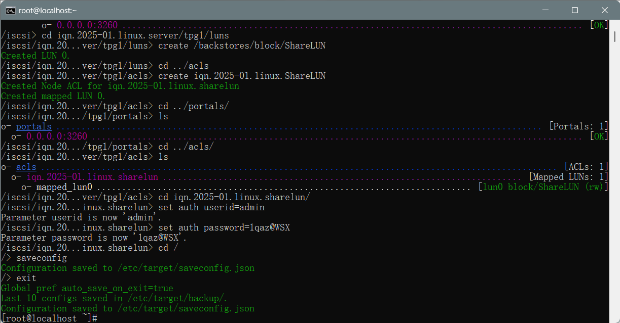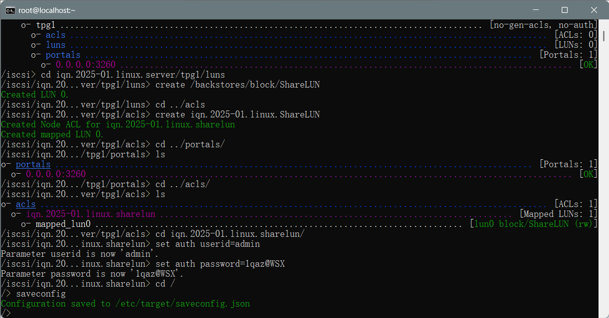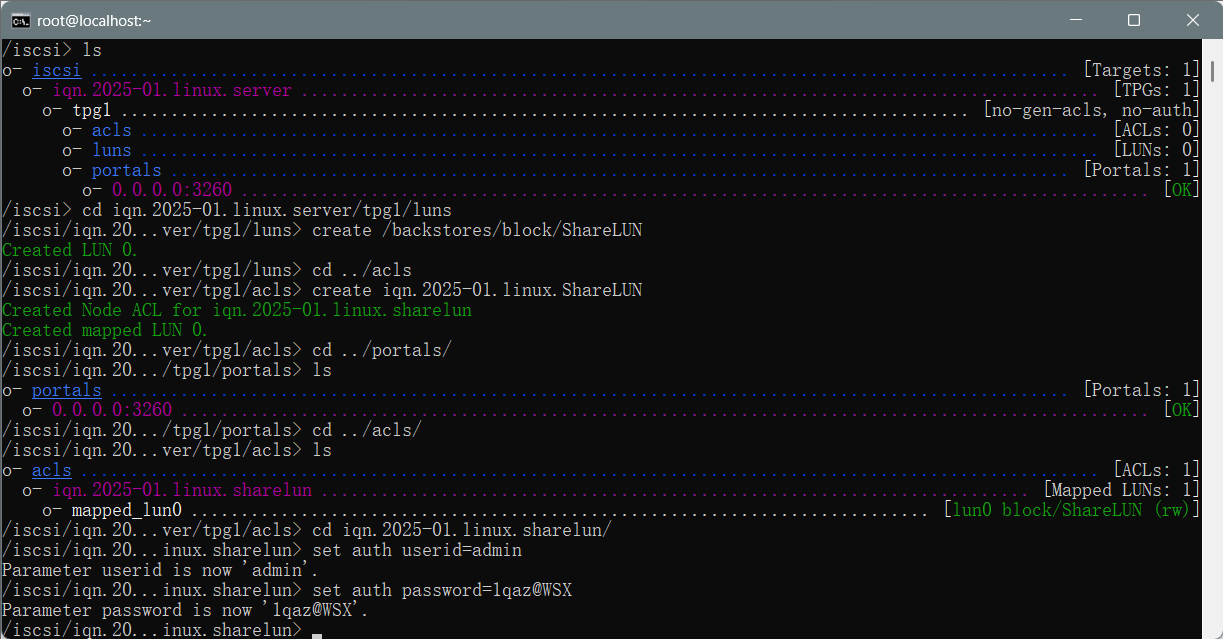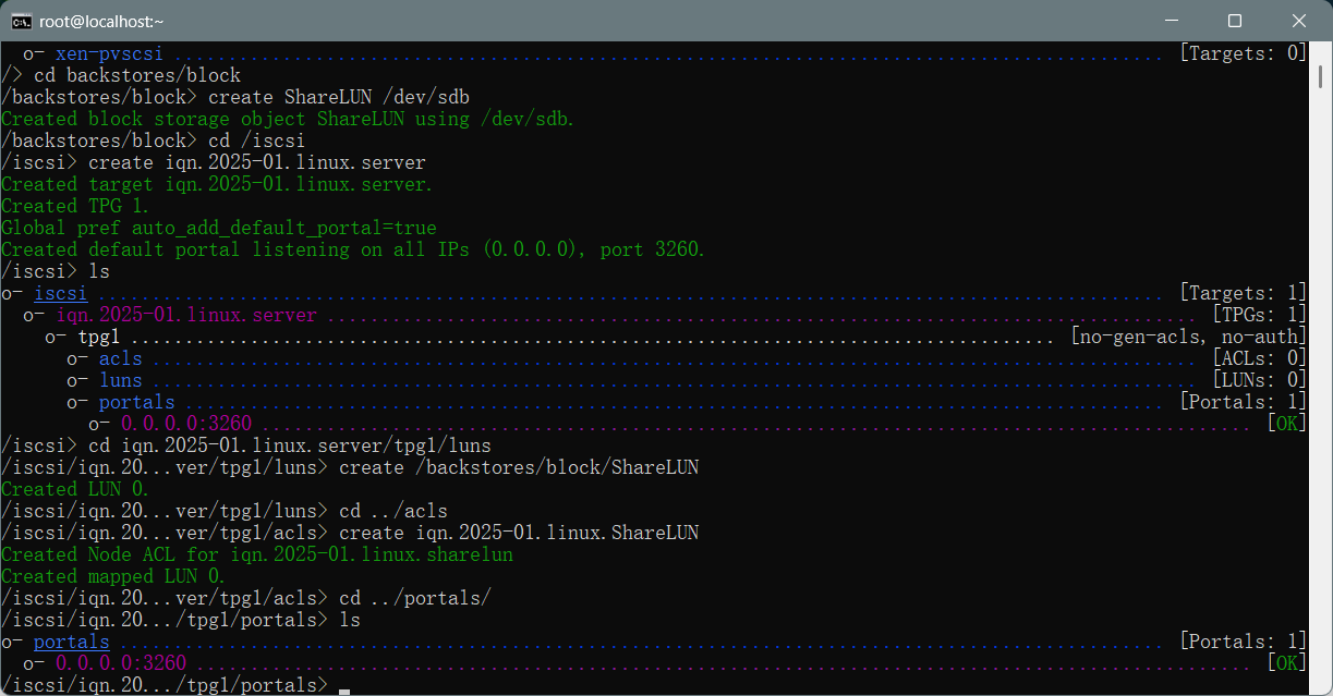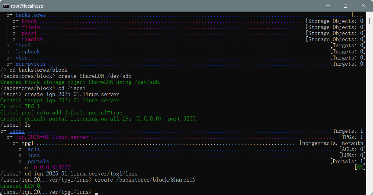 /iscsi/iqn.2025-01.linux.server/tpg1/luns > create /backstores/block/ShareLUN #指定块存