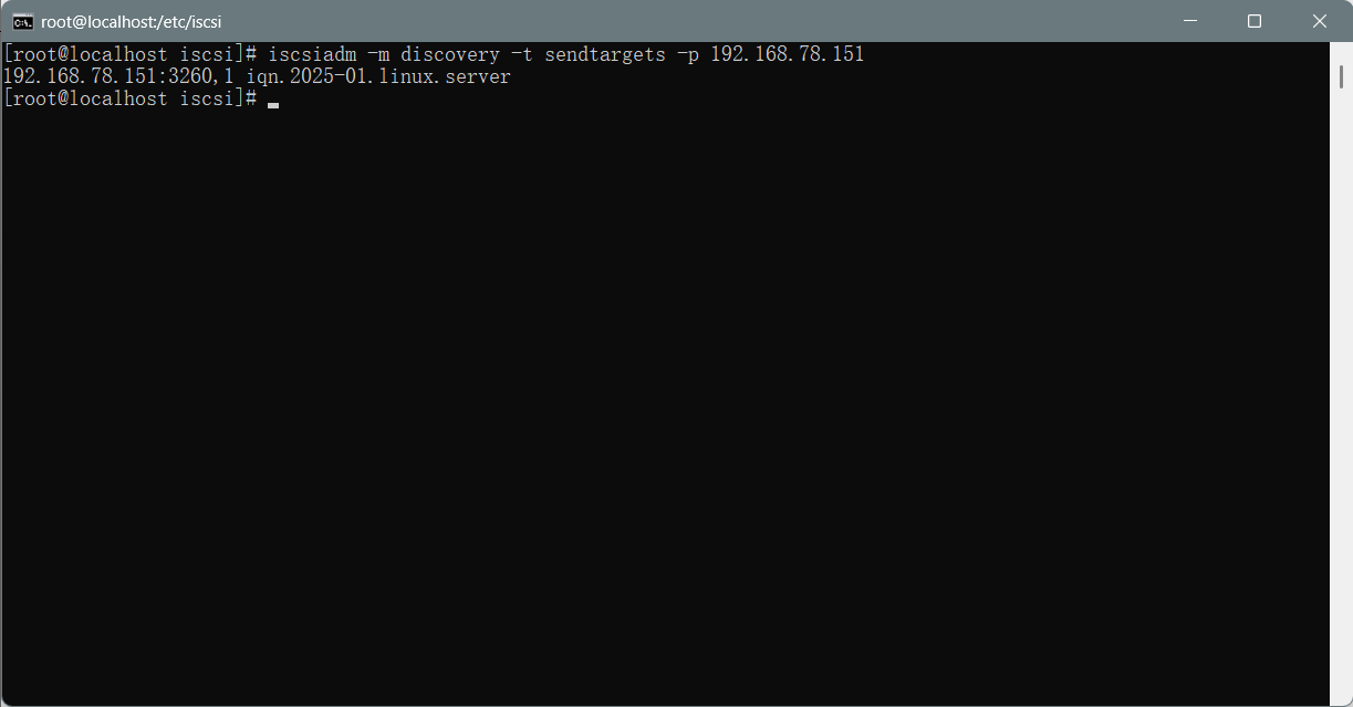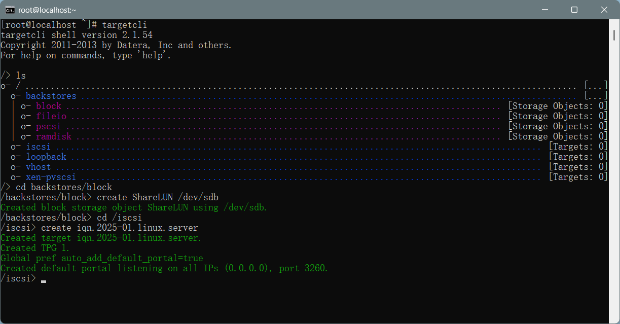 /iscsi> create iqn.2025-01.linux.server #创建iscsi target:iqn.2025-01.linux.server(名称自定义,命名规则)