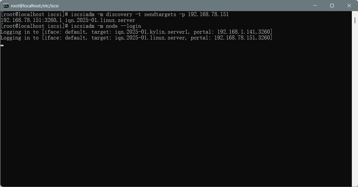 iscsiadm -m discovery -t sendtargets -p 192.168.0.1