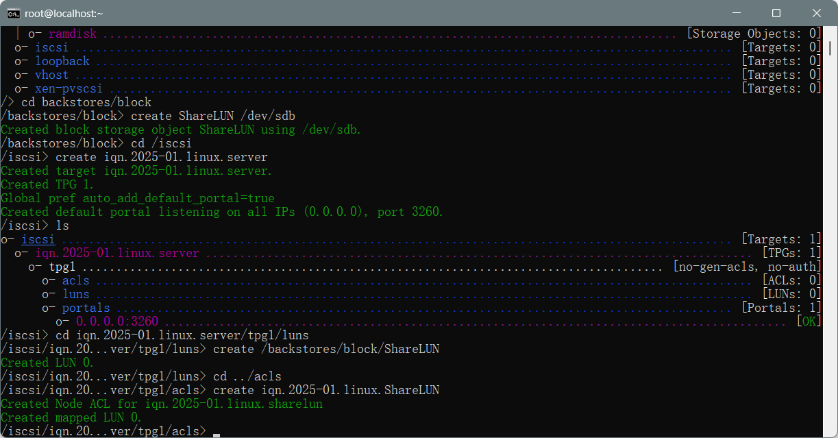 /iscsi/iqn.2025-01.linux.server/tpg1/acls> create iqn.2025-01.linux.ShareLUN #为Initator客户端创建ACL访问链接(客户端连接器),需要注意此访问链接名不要与ISCSI Target名称重复,可以把server改成LUN名如ShareLUN