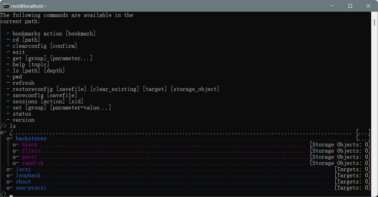 可以使用命令help显示可用命令帮助,在不同的层级目录下可以使用不同的配置命令。命令ls命令查看target层级配置目录