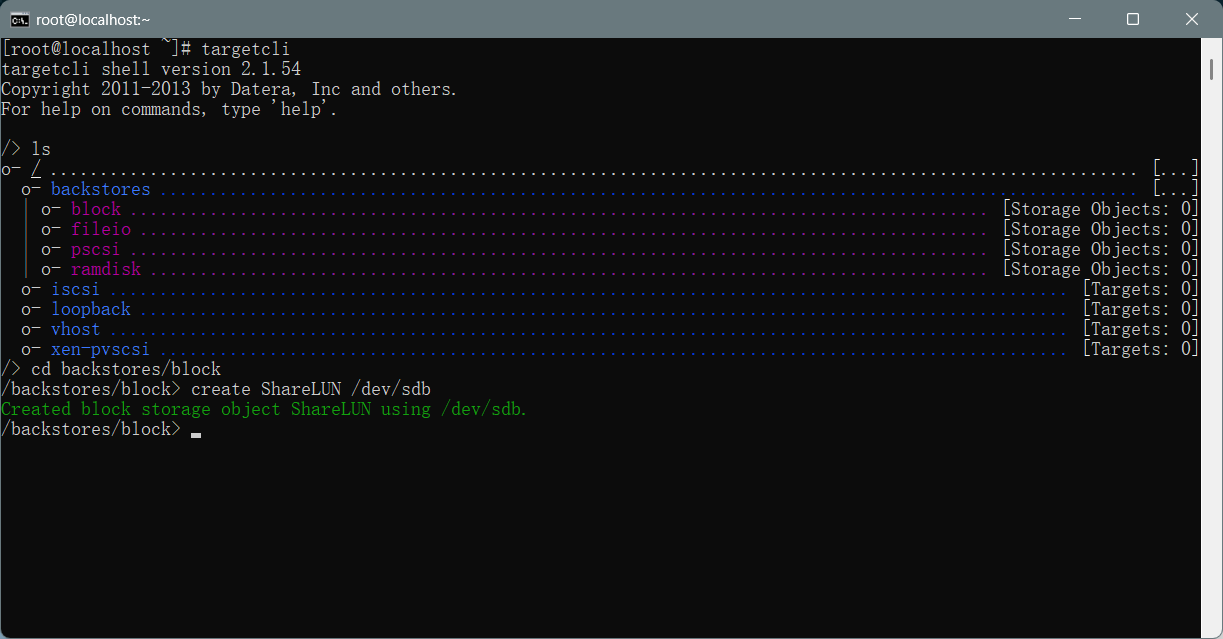 /backstores/block> create ShareLUN /dev/sdb #对/dev/sdb硬盘创建ShareLUN块存储对象