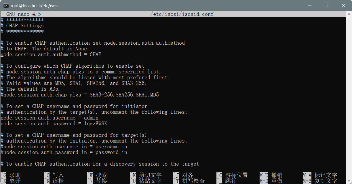 58 node.session.auth.authmethod = CHAP #删除前面的#号,取消注释