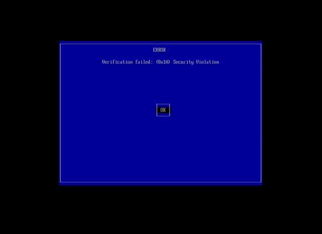 当电脑在启用安全启动(Secure Boot)时,使用 Ventoy 引导启动会遇到验证错误,屏幕上会弹出这样的提示: